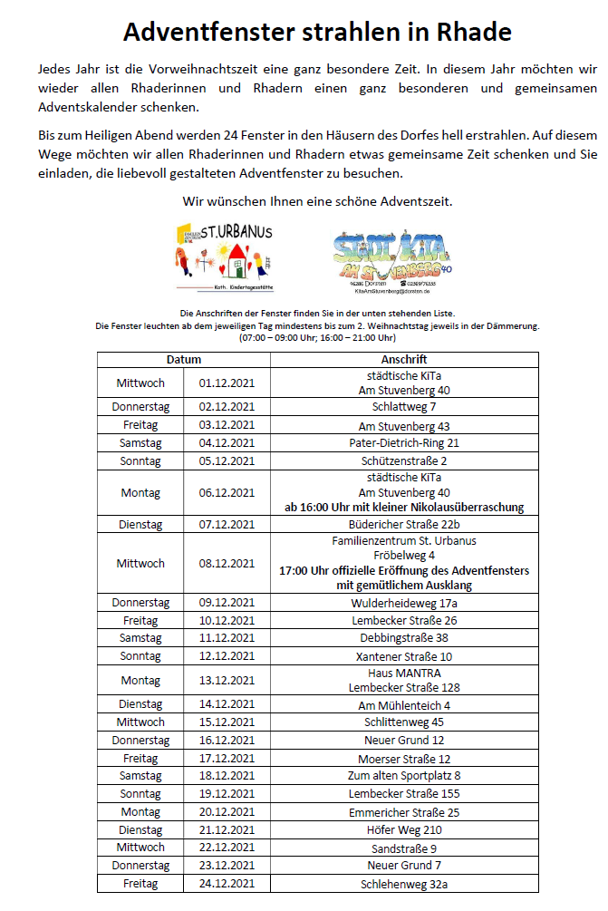 Vom 1. Dezember bis zum Heiligen Abend werden 24 Fenster in den Häusern des Dorfes hell erstrahlen. „Auf diesem Wege möchten wir allen Rhaderinnen und Rhadern etwas gemeinsame Zeit schenken und Sie einladen, die liebevoll gestalteten Adventfenster zu besuchen.“, sind sich die Leiterinnen der beiden Rhader Tageseinrichtungen für Kinder Silvia Römhild und Anna Stenpaß über anstehende Aktion einig.