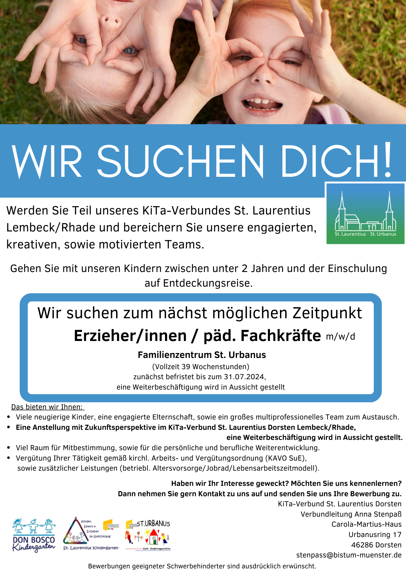 Werden Sie Teil unseres KiTa-Verbundes St. Laurentius Lembeck/Rhade und bereichern Sie unsere engagierten, kreativen, sowie motivierten Teams.