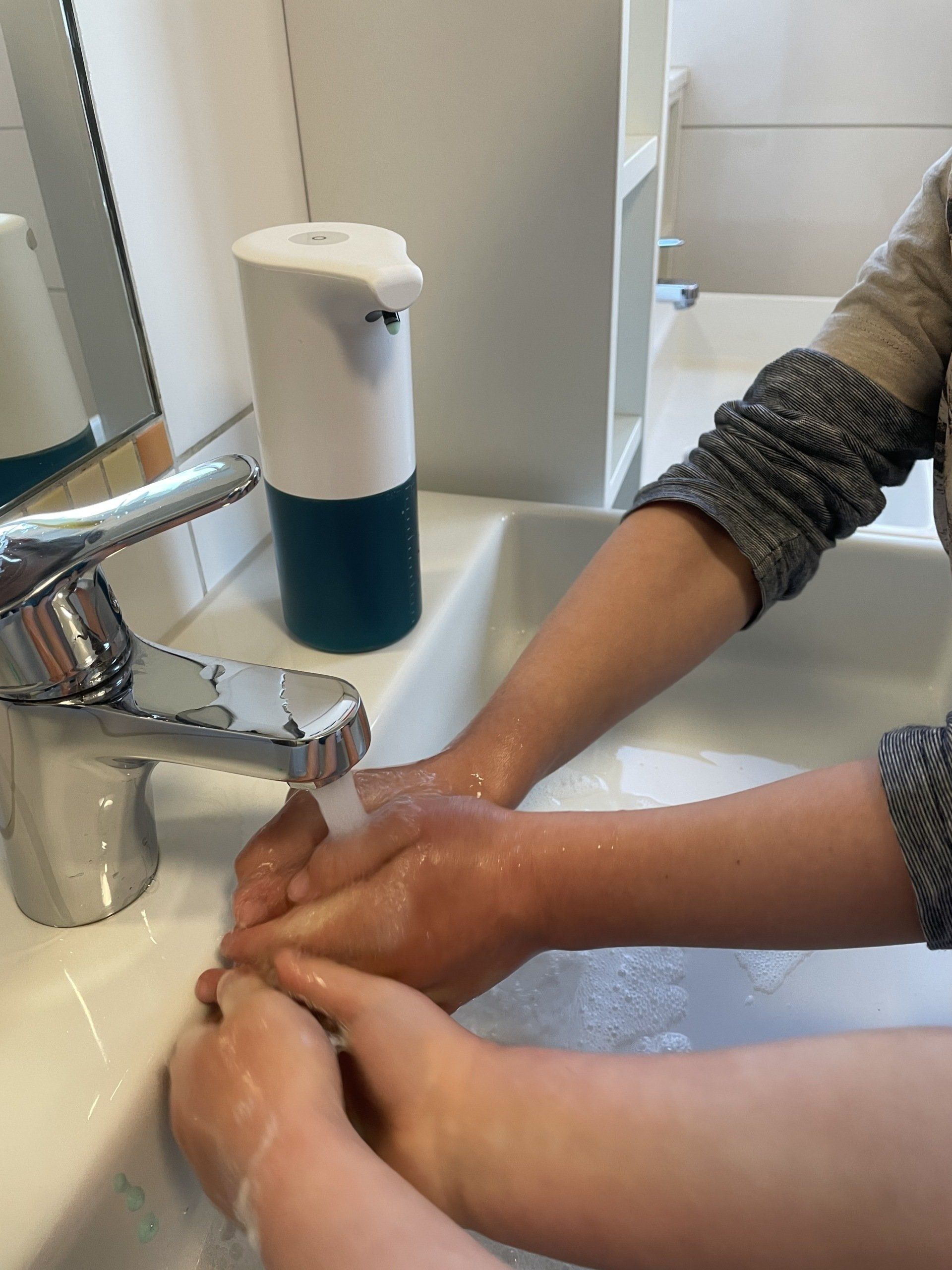 gespendeten kontaktlosen Seifenspender für die Waschräume unserer Kinder.