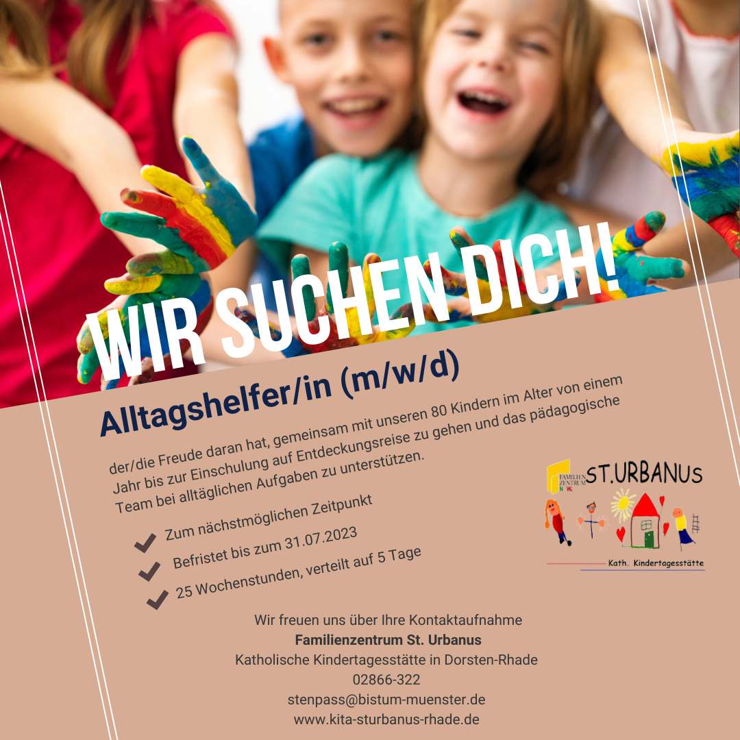 Alltagshelfer/in (m/w/d) gesucht, der/die Freude daran hat, gemeinsam mit unseren 80 Kindern im Alter von einem Jahr bis zur Einschulung auf Entdeckungsreise zu gehen und das pädagogische Team bei alltäglichen Aufgaben zu unterstützen.